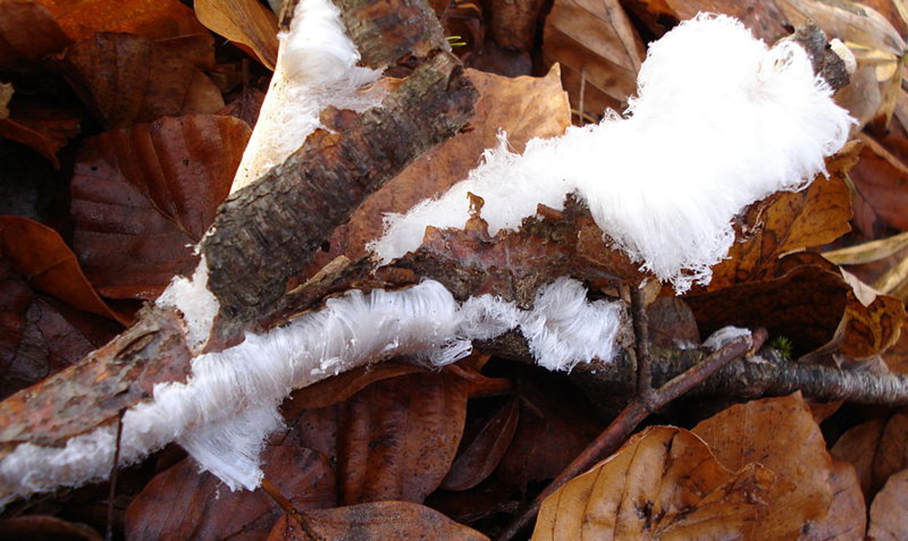 Haareis bildet sich auf Totholz unter ganz bestimmten Bedingungen. Die Entstehung ist wissenschaftlich noch nicht abschließend geklärt.
